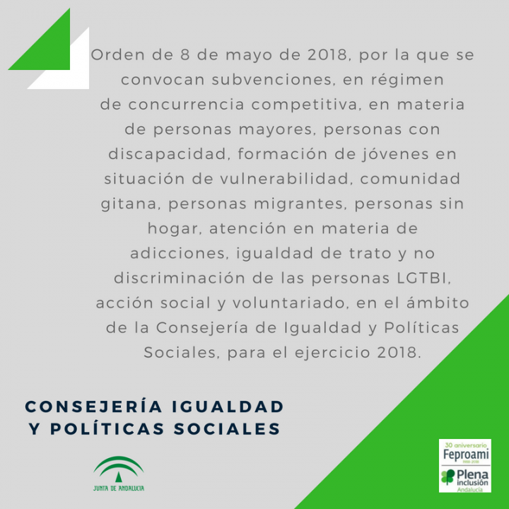 En BOJA nº 90, de fecha 11 de mayo, se publica Orden de 8 de mayo de 2018, por la que se convocan subvenciones, en régimen de concurrencia competitiva, en materia de personas mayores, personas con discapacidad, formación de jóvenes en situación de vulnerabilidad, comunidad gitana, personas migrantes, personas sin hogar, atención en materia de…