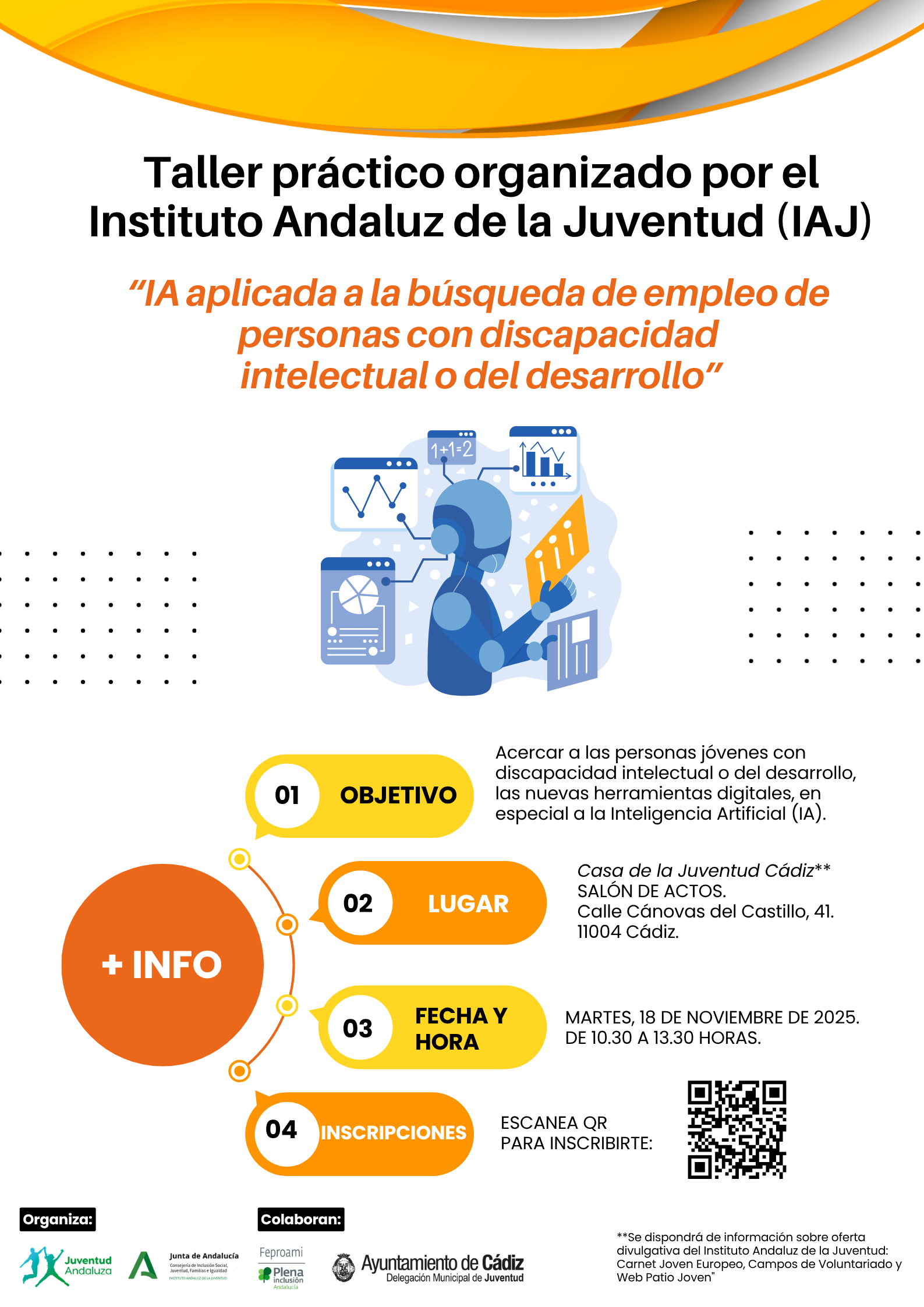 El próximo martes 18 de noviembre de 2025, FEPROAMI colabora con el Instituto Andaluz de la Juventud (IAJ) y el Ayuntamiento de Cádiz en la organización del taller “IA aplicada a la búsqueda de empleo de personas con discapacidad intelectual o del desarrollo”. La actividad se celebrará en la Casa de la Juventud de Cádiz…