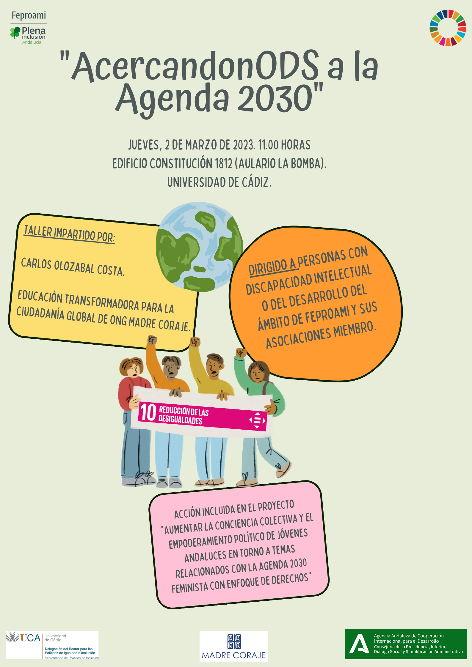 El Grupo de Trabajo #FeproamiODS promueve una actividad de formación/sensibilización dirigida a PERSONAS CON DISCAPACIDAD INTELECTUAL O DEL DESARROLLO de nuestras organizaciones, con la finalidad favorecer una ciudadanía competente, activa y responsable. FECHA/HORA: Jueves, 2 de marzo.11,00 HRS. IMPARTE: Carlos Olozabal Costa. Educación Transformadora para la Ciudadanía Global de ONG Madre Coraje. LUGAR: Edificio Constitución 1812.…