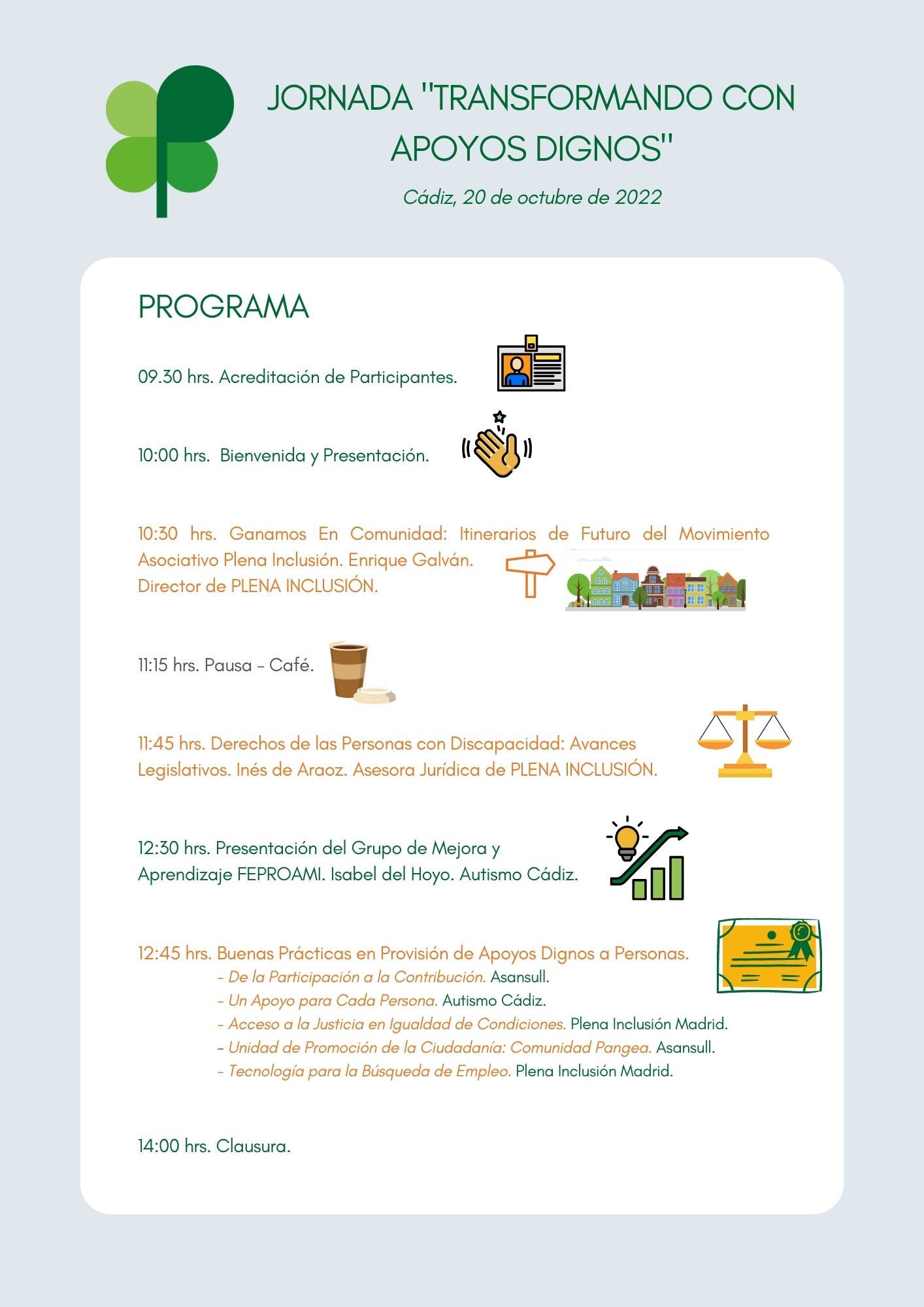 El Grupo de Aprendizaje y Mejora de la Federación Provincial de Organizaciones de Personas con Discapacidad Intelectual, Autismo y Parálisis Cerebral de Cádiz, FEPROAMI, comparte el programa definitivo de la Jornada “Transformando con Apoyos Dignos“, una vez se ha resuelto la selección de buenas prácticas en experiencias destacables en la prestación de apoyos a personas con…