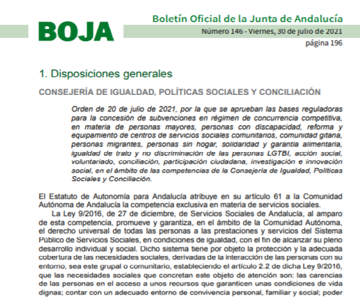Publicación en BOJA de 30 de julio de 2021, la Orden de 20 de julio de 2021, por la que se aprueban las bases reguladoras para la concesión de subvenciones en régimen de concurrencia competitiva, en materia de personas mayores, personas con discapacidad, reforma y equipamiento de centros de servicios sociales comunitarios, comunidad gitana, personas…