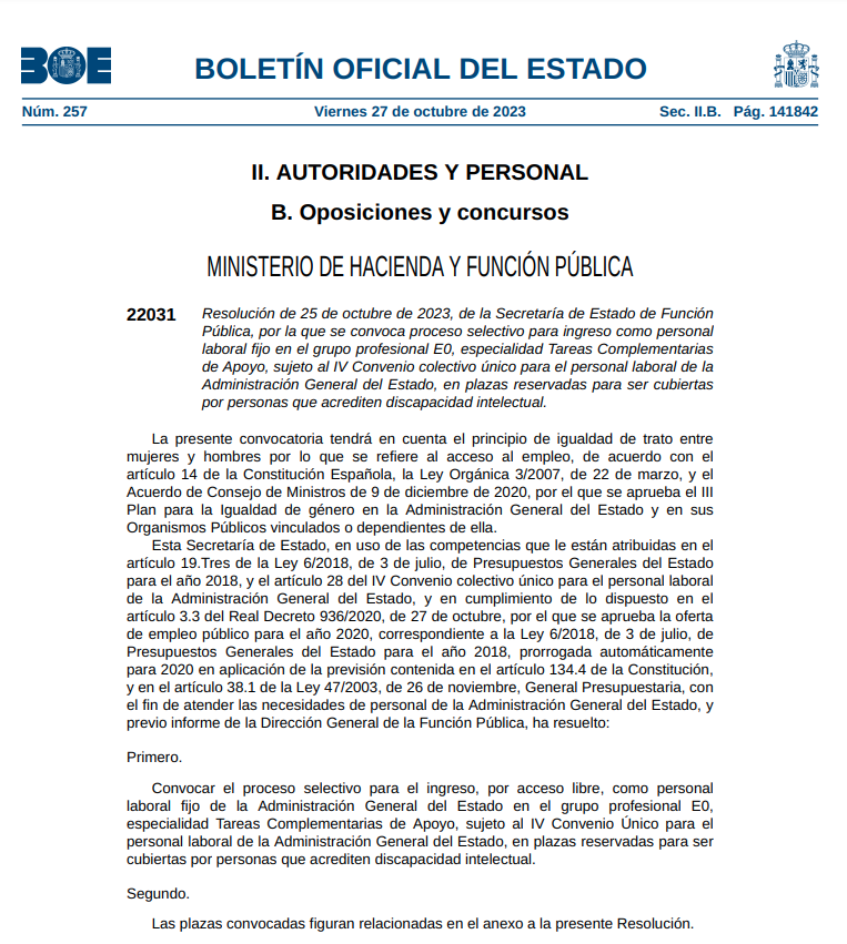 Con fecha 27 de octubre de 2023, se ha publicado Resolución de 25 de octubre de 2023, de la Secretaría de Estado de Función Pública, por la que se convoca proceso selectivo para ingreso como personal laboral fijo en el grupo profesional E0, especialidad Tareas Complementarias de Apoyo, sujeto al IV Convenio colectivo único para…