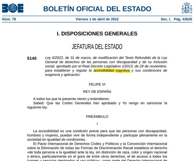El Boletín Oficial del Estado (BOE) en su nº 38 de hoy 1 de abril, publica la modificación del Texto Refundido de la Ley General de derechos de las personas con discapacidad y de su inclusión social para regular la accesibilidad cognitiva. En concreto se trata de la Ley 6/2022, de 31 de marzo, de modificación del…