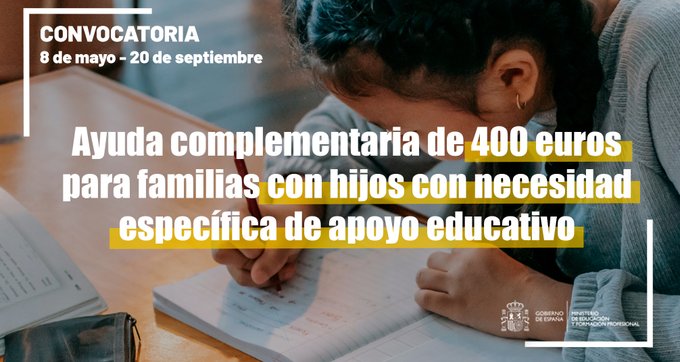 La convocatoria para solicitar ayudas complementarias de 400 euros para alumnos con necesidades específicas de apoyo educativo se abre este lunes, 8 de mayo, según indicó la resolución publicada el pasado 26 de abril en el Boletín Oficial del Estado (BOE). En concreto, la convocatoria hace referencia de ayudas individualizadas para el próximo curso 2023-2024 para los alumnos, incluyendo al alumnado con…