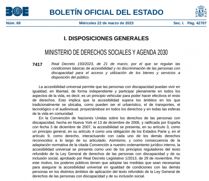 El Boletín Oficial del Estado (BOE) publica hoy el Real Decreto 193/2023, de 21 de marzo, por el que se regulan las condiciones básicas de accesibilidad y no discriminación de las personas con discapacidad para el acceso y utilización de los bienes y servicios a disposición del público, después de su aprobación el pasado lunes…