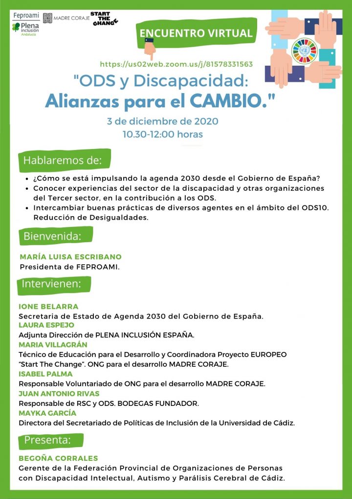 Desde 2018, en FEPROAMI estamos trabajando activamente en sensibilizar y contribuir a los Objetivos de ODS, contribución que recogemos en nuestro Plan Estratégico 2020-22. Con motivo del Día mundial de la Discapacidad, el día 3 diciembre, vamos a llevar a cabo un Encuentro Virtual: «ODS y Discapacidad: Alianzas para el CAMBIO», en horario de 10.30-12…
