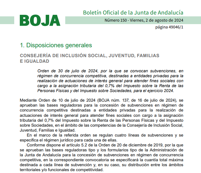 En BOJA nº 151 de 8 de agosto, se publica la Orden de 1 de agosto de 2022, por la que se convocan subvenciones, en régimen de concurrencia competitiva, destinadas a entidades privadas para la realización de actuaciones de interés general para atender fines sociales con cargo a la asignación tributaria del 0,7% del Impuesto sobre la Renta de las…