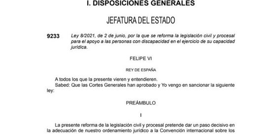 Publicada en el BOE nº 132 de 3 de junio, la Ley 8/2021, de 2 de junio, por la que se reforma la legislación civil y procesal para el apoyo a las personas con discapacidad en el ejercicio de su capacidad jurídica.